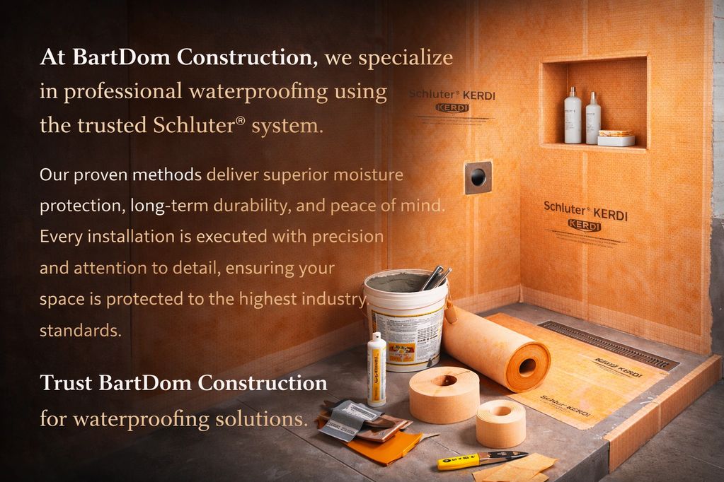 At BartDom Construction, we offer waterproofing services using the reliable Schluter system, providing effective and lasting protection for your spaces. Trust us to deliver quality waterproofing solutions tailored to your needs.
